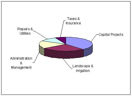 The assessment is billed in December of each year and due in January. Each member is obligated to pay the annual assessment to the Wind Ridge Homeowners Association. These funds are primarily used for the upkeep and appearance of our area. The assessment is collected by our HOA management company. The pie chart at left illustrates the typical allocation of these funds. About two thirds of your assessment goes for capital improvements, repairs, utilities, landscaping and Irrigation.